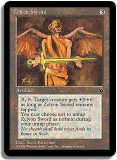 <3,T>: Target creature gets +2/+0 as long as Zelyon Sword remains tapped. You may choose not to untap Zelyon Sword as normal during your untap phase.