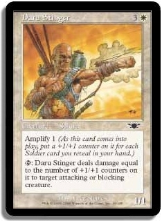 Tap: Daru Stinger deals damage equal to the number of +1/+1 counters on it to target attacking or blocking creature.