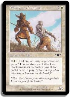 1W: Until end of turn, target creature gains "This creature can't attack or block unless its controller pays for each Cleric in play. (This cost is paid as attackers or blockers are declared.) "