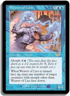 When Weaver of Lies is turned face up, turn any number of target creatures with morph other than Weaver of Lies face down.