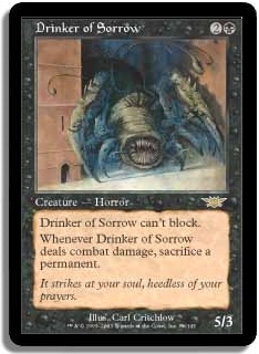 Whenever Drinker of Sorrow deals combat damage, sacrifice a permanent.