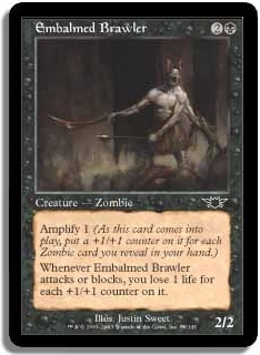 Amplify 1 (As this card comes into play, put a +1/+1 counter on it for each Zombie card you reveal in your hand.)
