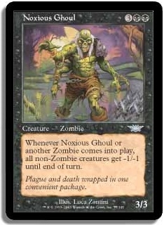 Whenever Noxious Ghoul or another Zombie comes into play, all non-Zombie creatures get -1/-1 until end of turn.