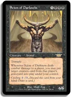 Whenever Scion of Darkness deals combat damage to a player, you may put target creature card from that player's graveyard into play under your control.