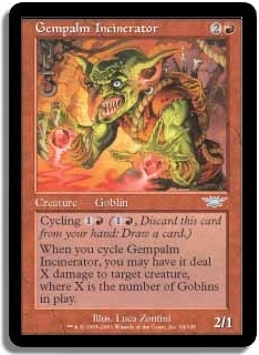 When you cycle Gempalm Incinerator, you may have it deal X damage to target creature, where X is the number of Goblins in play.