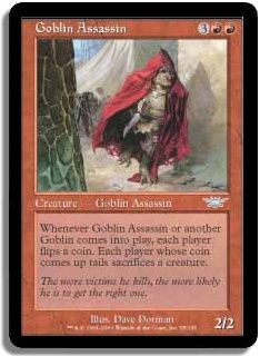 Whenever Goblin Assassin or another Goblin comes into play, each player flips a coin. Each player whose coin comes up tails sacrifices a creature.