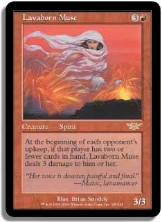 At the beginning of each opponent's upkeep, if that player has two or fewer cards in hand, Lavaborn Muse deals 3 damage to him or her.