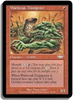 When Warbreak Trumpeter is turned face up, put X 1/1 red Goblin creature tokens into play.