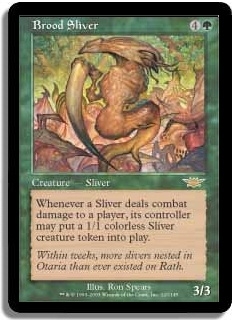 Whenever a Sliver deals combat damage to a player, its controller may put a 1/1 colorless Sliver creature token into play.