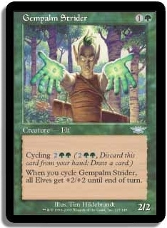 When you cycle Gempalm Strider, all Elves get +2/+2 until end of turn.