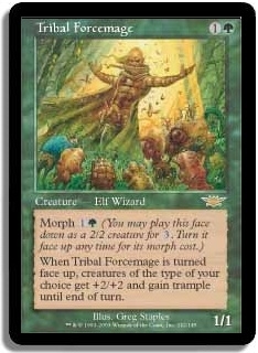 When Tribal Forcemage is turned face up, creatures of the type of your choice get +2/+2 and gain trample until end of turn.