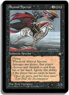Flying. Whenever Abyssal Specter damages any player, that player chooses and discards a card from his or her hand. Ignore this ability if the player has no cards in hand.