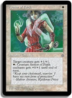 Target creature gets +1/+1. <W>: Creature Armor of Faith enchants gets +0/+1 until end of turn.