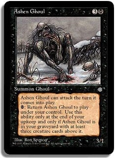 Ashen Ghoul can attack the turn it comes into play. <B>: Return Ashen Ghoul to play under your control. Use this ability only at the end of your upkeep and only if Ashen Ghoul is in your graveyard with at least three creature cards above it.