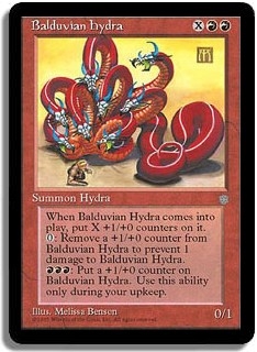 When Balduvian Hydra comes into play, put X +1/+0 counters on it. <0>: Remove a +1/+0 counter from Balduvian Hydra to prevent 1 damage to Balduvian Hydra. <RRR>: Put a +1/+0 counter on Balduvian Hydra. Use this ability only during your upkeep.