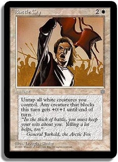 Untap all white creatures you control. Any creature that blocks this turn gets +0/+1 until end of turn.