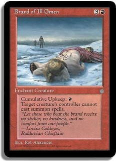 Cumulative Upkeep: <R>. Target creature's controller cannot cast summon spells.