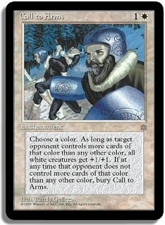 Choose a color. As long as target opponent controls more cards of that color than any other color, all white creatures get +1/+1. If at any time that opponent does not control more cards of that color than any other color, bury Call to Arms.