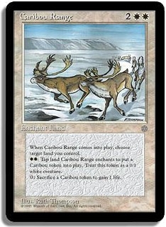 When Caribou Range comes into play, choose target land you control. <WW>: Tap land Caribou Range enchants to put a Caribou token into play. Treat this token as a 0/1 white creature. <0>: Sacrifice a Caribou token to gain 1 life.