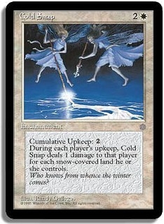 Cumulative Upkeep: <2>. During each player's upkeep, Cold Snap deals 1 damage to that player for each snow-covered land he or she controls.