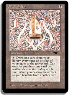 <3>: Draw one card from your library every time an artifact of yours goes to the graveyard. Can only let you draw one card per artifact destruction. May not be used when you destroy an artifact to gain benefits from another card.