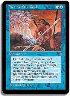 <1U>: Take target white or black creature from your graveyard and put it directly into play as though it were just summoned. That creature now requires an additional Cumulative Upkeep: <2>. If the creature leaves play, remove it from the game.