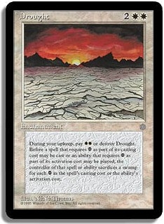 During your upkeep, pay <WW> or destroy Drought. Before a spell that requires <B> as part of its casting cost may be cast, or an ability that requires <B> as part of its activation cost may be played, the controller of that spell or ability sacrifices a swamp for each <B> in the spell's casting cost or the ability's activation cost.