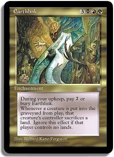 During your upkeep, pay <2> or bury Earthlink. Whenever a creature is put into the graveyard from play, that creature's controller sacrifices a land. Ignore this effect if that player controls no lands.