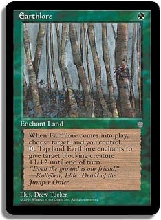 When Earthlore comes into play, choose target land you control. <0>: Tap land Earthlore enchants to give target blocking creature +1/+2 until end of turn.