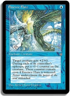 Target creature gets +2/+0. During each of its controller's upkeeps, put a -0/-1 counter on the creature. These counters remain even if Essence Flare is removed.