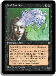 Cannot be declared as a blocking creature. <B>: Pay 1 life to return Foul Familiar to owner's hand. Effects that prevent or redirect damage cannot be used to counter this loss of life.
