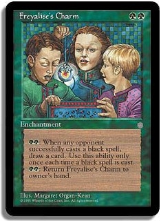 <GG>: When any opponent successfully casts a black spell, draw a card. Use this ability only once each time a black spell is cast. <GG>: Return Freyalise's Charm to owner's hand.