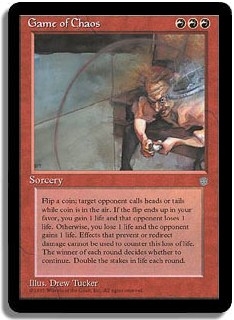 Flip a coin; target opponent calls heads or tails while coin is in the air. If the flip ends up in your favor, you gain 1 life and that opponent loses 1 life. Otherwise, you lose 1 life and the opponent gains 1 life. Effects that prevent or redirect damage cannot be used to counter this loss of life. The winner of each round decides whether to continue. Double the stakes in life each round.