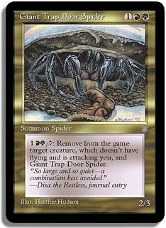 <1RG,T>: Remove from the game target creature, which doesn't have flying and is attacking you, and Giant Trap Door Spider.