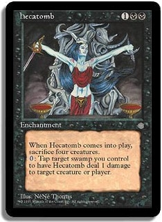 When Hecatomb comes into play, sacrifice four creatures. <0>: Tap target swamp you control to have Hecatomb deal 1 damage to target creature or player.