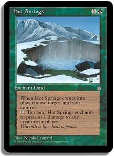 When Hot Springs comes into play, choose target land you control. <0>: Tap land Hot Springs enchants to prevent 1 damage to any creature or player.