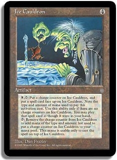 <X,T>: Put a charge counter on Ice Cauldron, and put a spell card face up on Ice Cauldron. Note the type and amount of mana used to pay this activation cost. Use this ability only if there are no charge counters on Ice Cauldron. You may play that spell as though it were in your hand. <T>: Remove the charge counter from Ice Cauldron to add mana of the type and amount last used to put a charge counter on Ice Cauldron to your mana pool. This mana is usable only to cast the spell on top of Ice Cauldron.