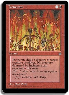 Incinerate deals 3 damage to target creature or player. No creature damaged by Incinerate can regenerate this turn.