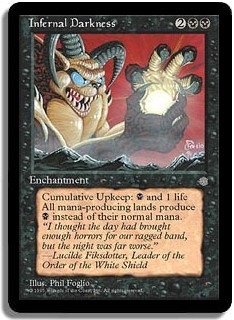 Cumulative Upkeep: <B> and 1 life. All mana-producing lands produce <B> instead of their normal mana.