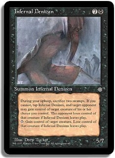 During your upkeep, sacrifice two swamps. If you cannot, tap Infernal Denizen, and target opponent may gain control of target creature of his or her choice you control. The opponent loses control of that creature if Infernal Denizen leaves play. <T>: Gain control of target creature. Lose control of that creature if Infernal Denizen leaves play.