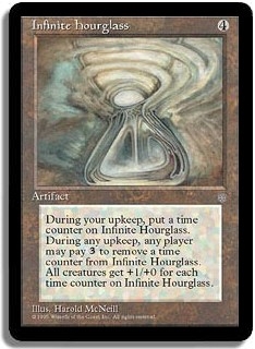 During your upkeep, put a time counter on Infinite Hourglass. During any upkeep, any player may pay <3> to remove a time counter from Infinite Hourglass. All creatures get +1/+0 for each time counter on Infinite Hourglass.