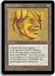Comes into play tapped. <1,T>: Sacrifice Jester's Mask to look through target opponent's hand and library. Give that player a new hand of as many cards as he or she had before. Reshuffle the remaining cards afterwards.
