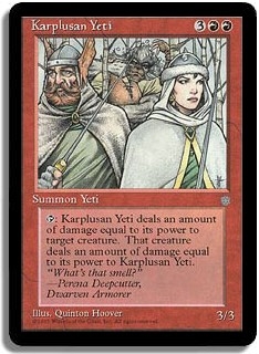 <T>: Karplusan Yeti deals an amount of damage equal to its power to target creature. That creature deals an amount of damage equal to its power to Karplusan Yeti.