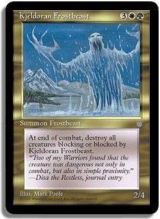 At end of combat, destroy all creatures blocking or blocked by Kjeldoran Frostbeast.