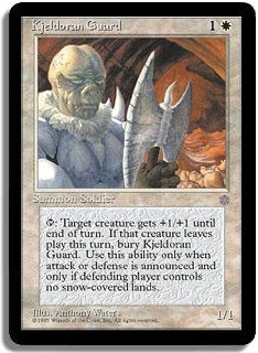<T>: Target creature gets +1/+1 until end of turn. If that creature leaves play this turn, bury Kjeldoran Guard. Use this ability only when attack or defense is announced and only if defending player controls no snow-covered lands.