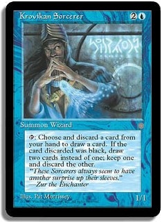 <T>: Choose and discard a card from your hand to draw a card. If the card discarded was black, draw two cards instead of one; keep one and discard the other.