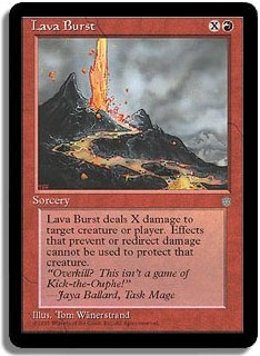 Lava Burst deals X damage to target creature or player. Effects that prevent or redirect damage cannot be used to protect that creature.