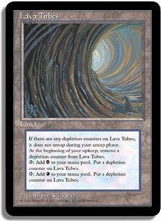 If there are any depletion counters on Lava Tubes, it does not untap during your untap phase. At the beginning of your upkeep, remove a depletion counter from Lava Tubes. <T>: Add <B> to your mana pool. Put a depletion counter on Lava Tubes. <T>: Add <R> to your mana pool. Put a depletion counter on Lava Tubes.