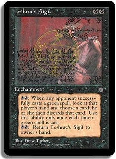 <BB>: When any opponent successfully casts a green spell, look at that player's hand and choose a card; he or she then discards that card. Use this ability only once each time a green spell is cast. <BB>: Return Leshrac's Sigil to owner's hand.