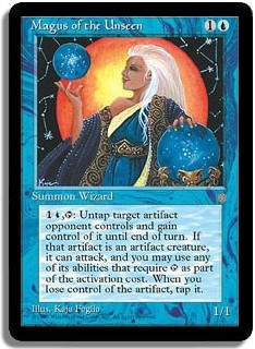 <1U,T>: Untap target artifact opponent controls and gain control of it until end of turn. If that artifact is an artifact creature, it can attack, and you may use any of its abilities that require <T> as part of the activation cost. When you lose control of the artifact, tap it.